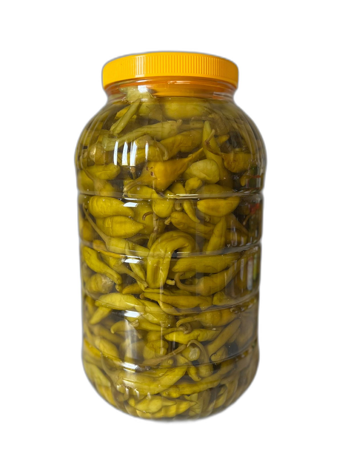 Πιπεριές τουρσί σε μεγάλο πλαστικό βάζο, κατάλληλο για επαγγελματική χρήση.