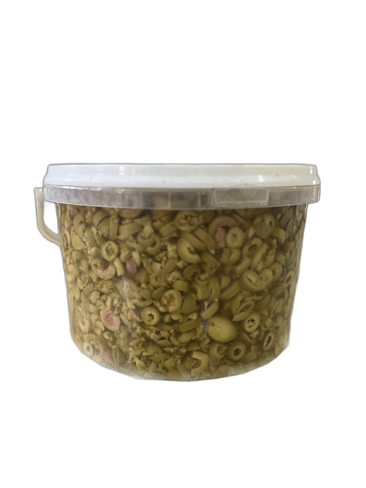 Πράσινες ελιές σε ροδέλες, κατάλληλες για σαλάτες και πίτσες.